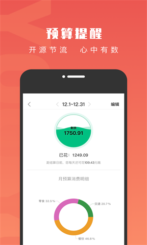 2.预算功能:每记一笔,您会知道您今天、这周、这个月还有多少预算可以支出,做到心中有数;