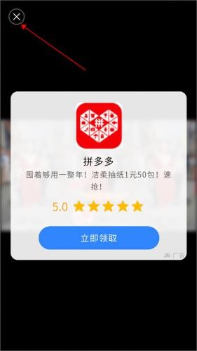 3、视频观看完毕后,点击右上角的关闭图标(下图红色箭头所示),不要点击立即领取,这样会跳转视频商家页面的。